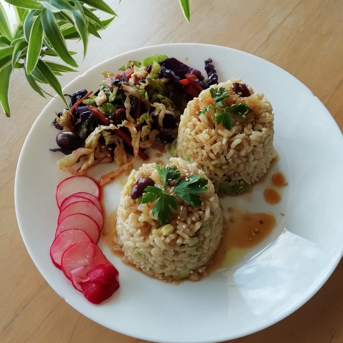 Este plato es equilibrado porque tiene todos los macro y micronutrienes necesarios para nuestro organismo. Compuesto por: arroz integral que nos aporta carbohidratos de buena calidad; judias pintas que es la parte de la proteina, y verduras, todo ell